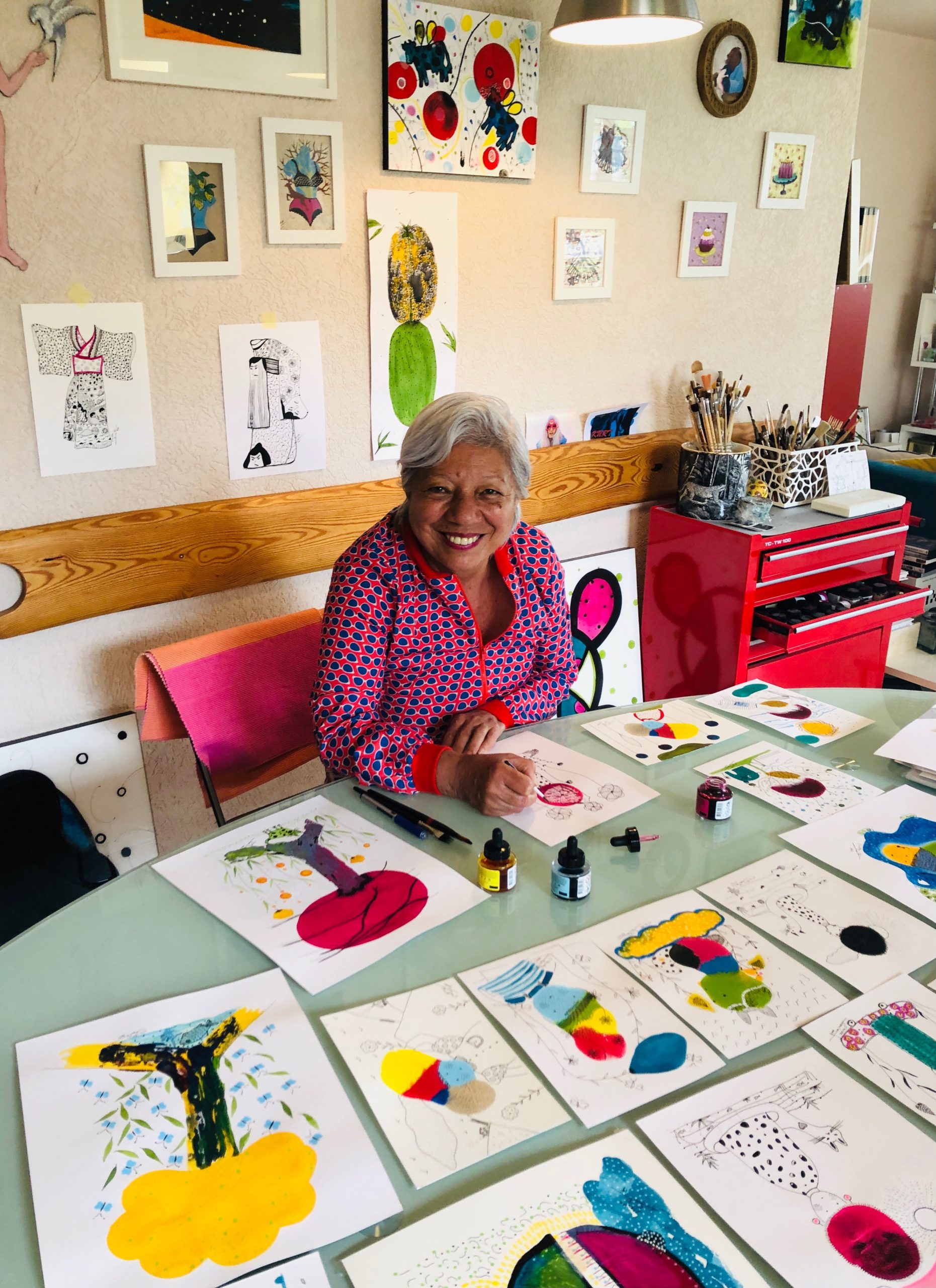 Désormais installée à Yverdon, en Suisse, ce n’est qu’en 1998 qu’elle retrouve sa verve créatrice grâce à un emploi à la commune de Lausanne : dans un premier temps, elle réalise des affiches puis est chargée de former les nouveaux venus de cet atelier. Dès lors, elle débute parallèlement une série de collages et d’aquarelles.